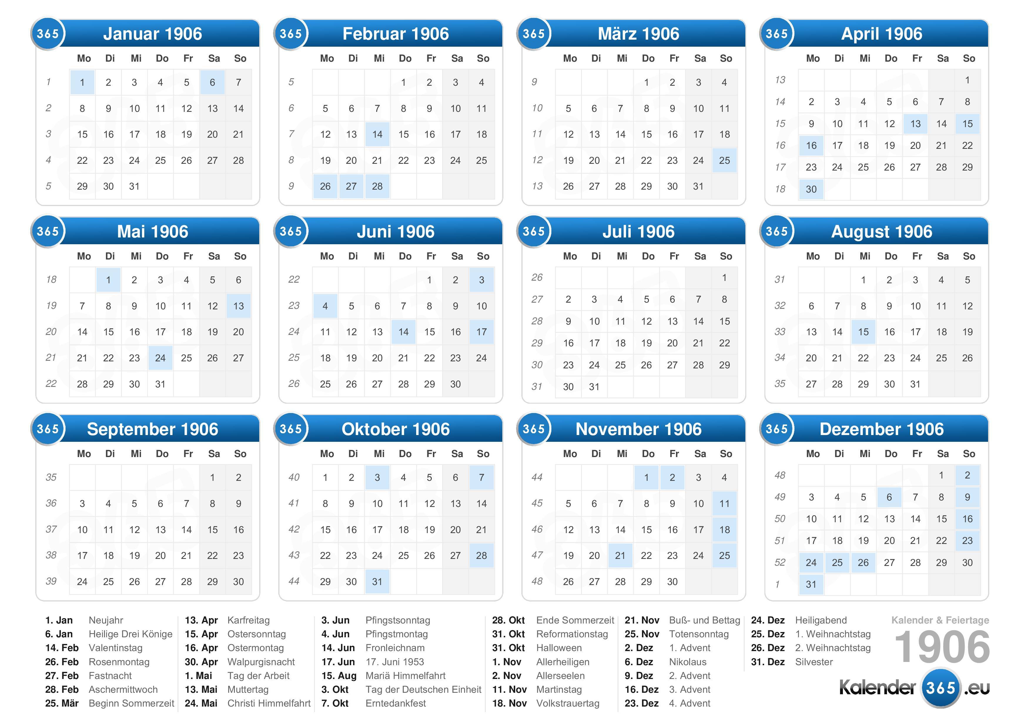 Laden Sie die Kalender 1906 mit feiertagen. (Hochformat - 1 Seite)