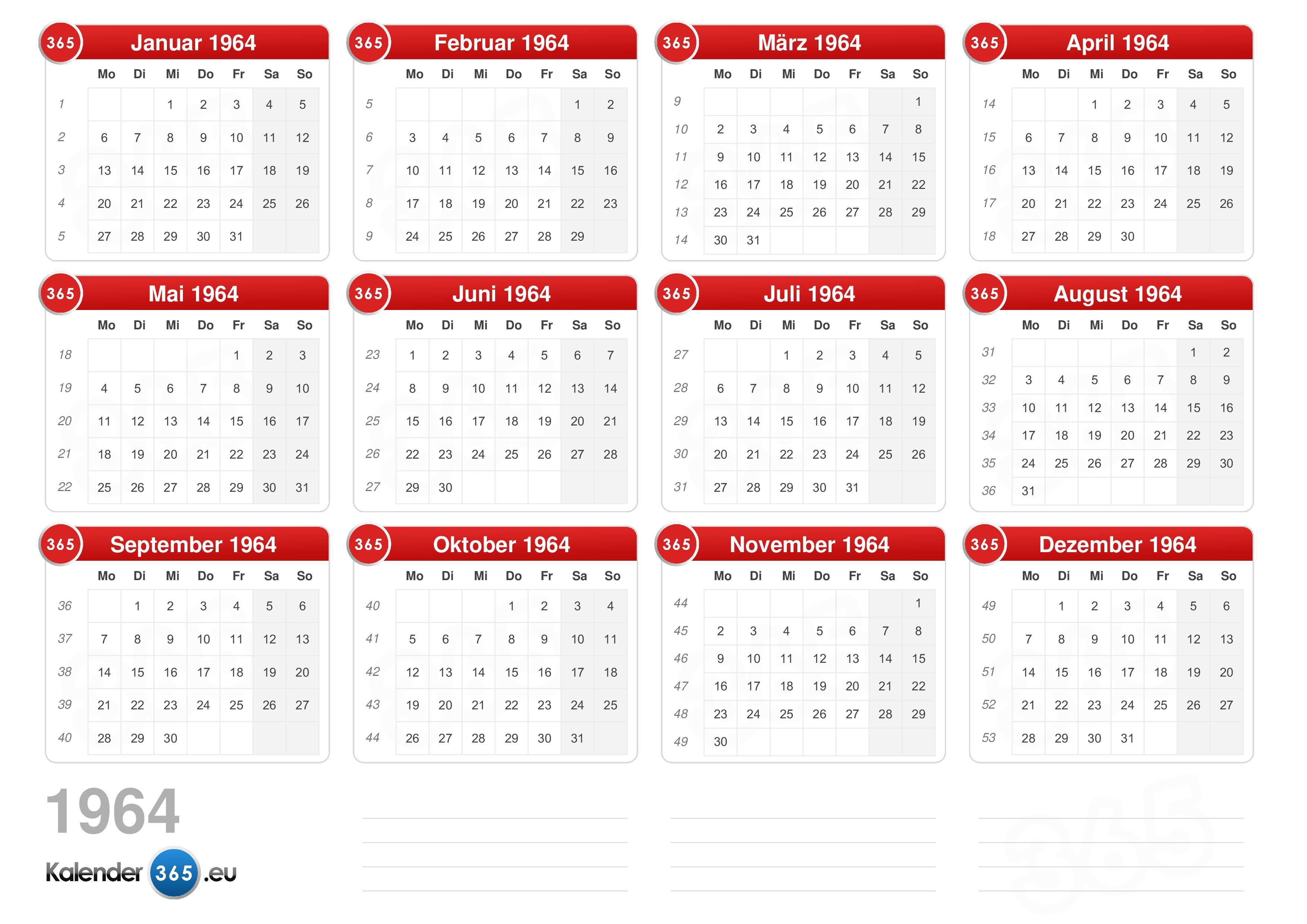 Kalender für 1964 als PDF/JPG-Vorlagen in 3 Varianten zum Download und Ausdrucken (kostenlos).Die verfügbaren Dateiformate sind PDF (Adobe Reader PDF) und JPG (Bild).