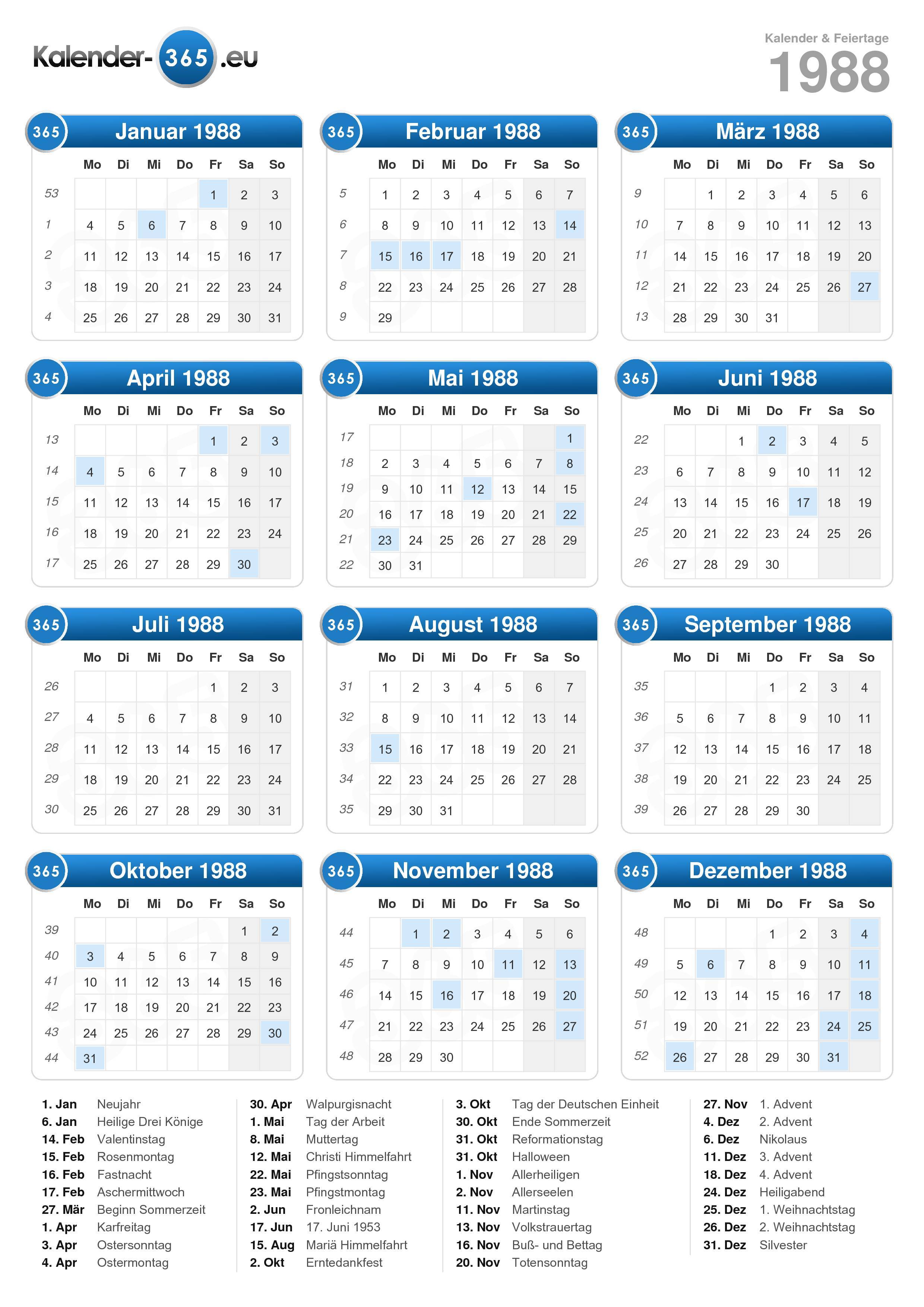 Laden Sie die Kalender 1988 mit feiertagen. (Hochformat - 1 Seite)