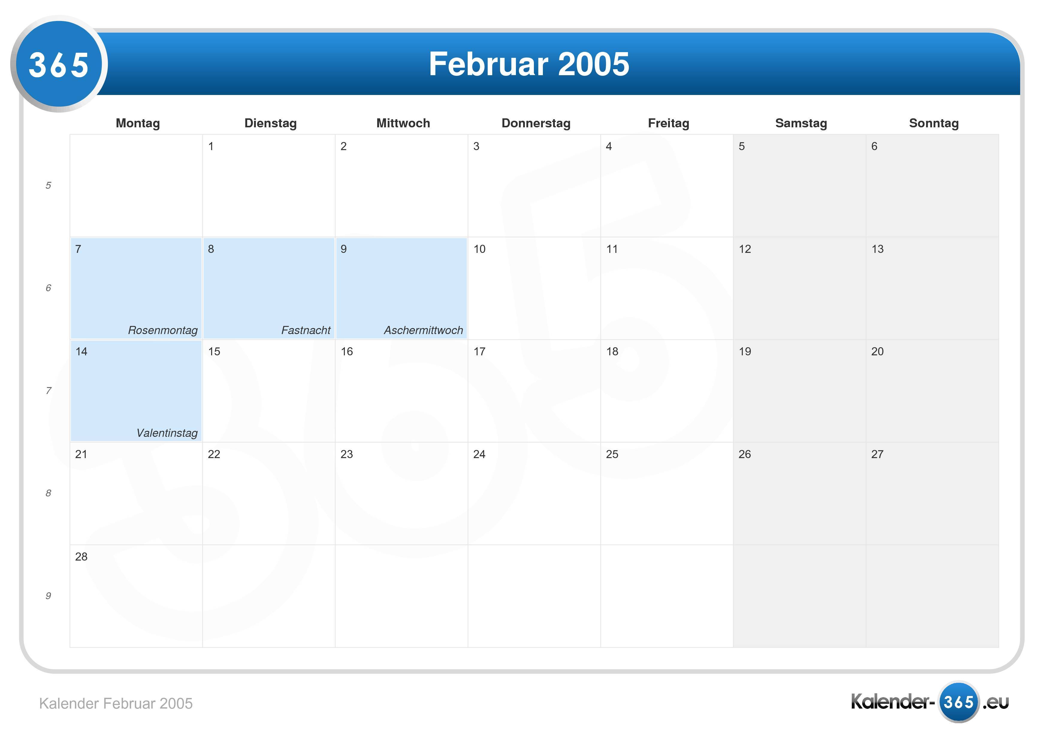 Dieser Februar 2005 Kalender ist hilfreich zum ersehen von z.B. Urlaubszeiten.