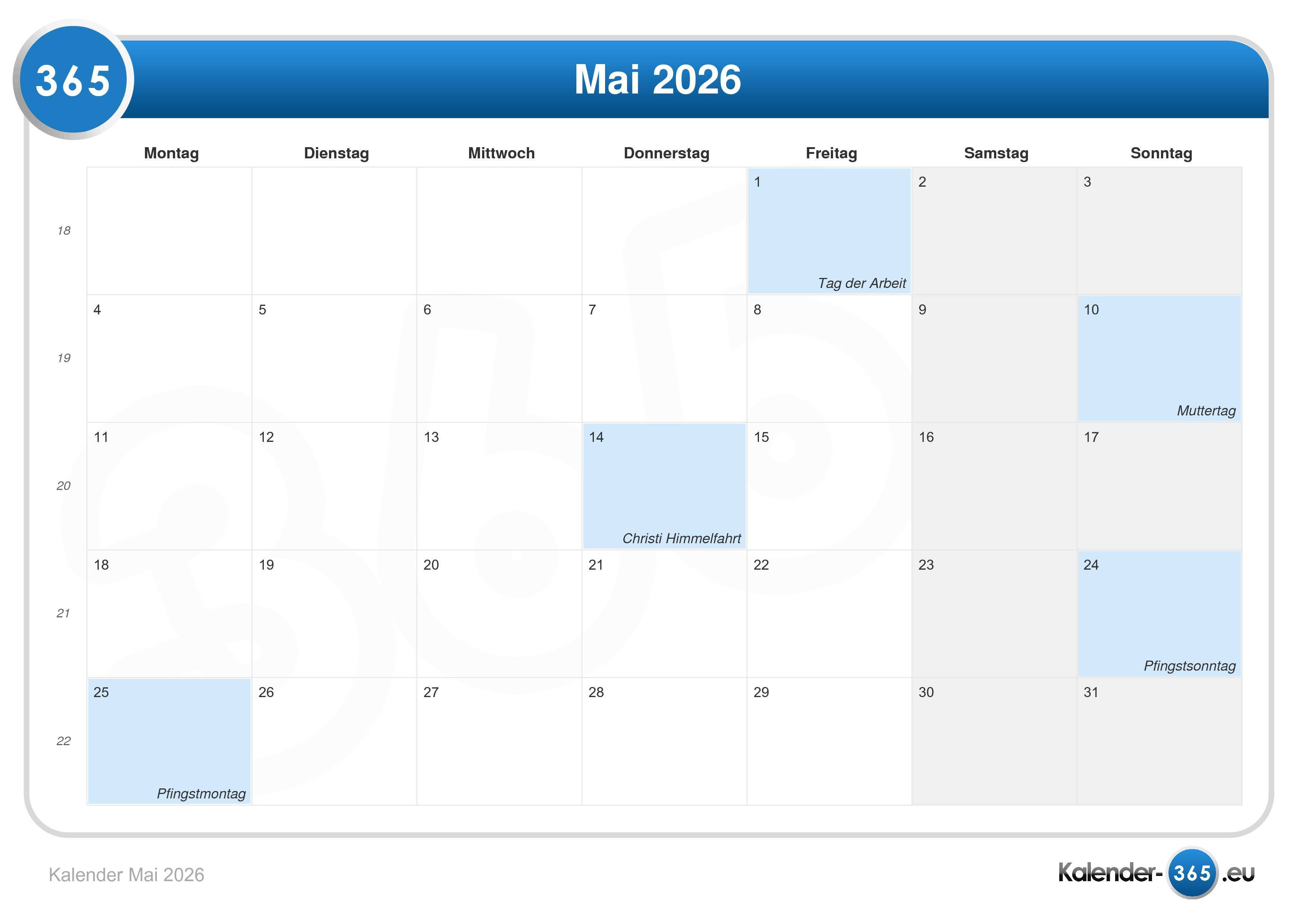 Dieser Mai 2026 Kalender ist hilfreich zum ersehen von z.B. Urlaubszeiten.