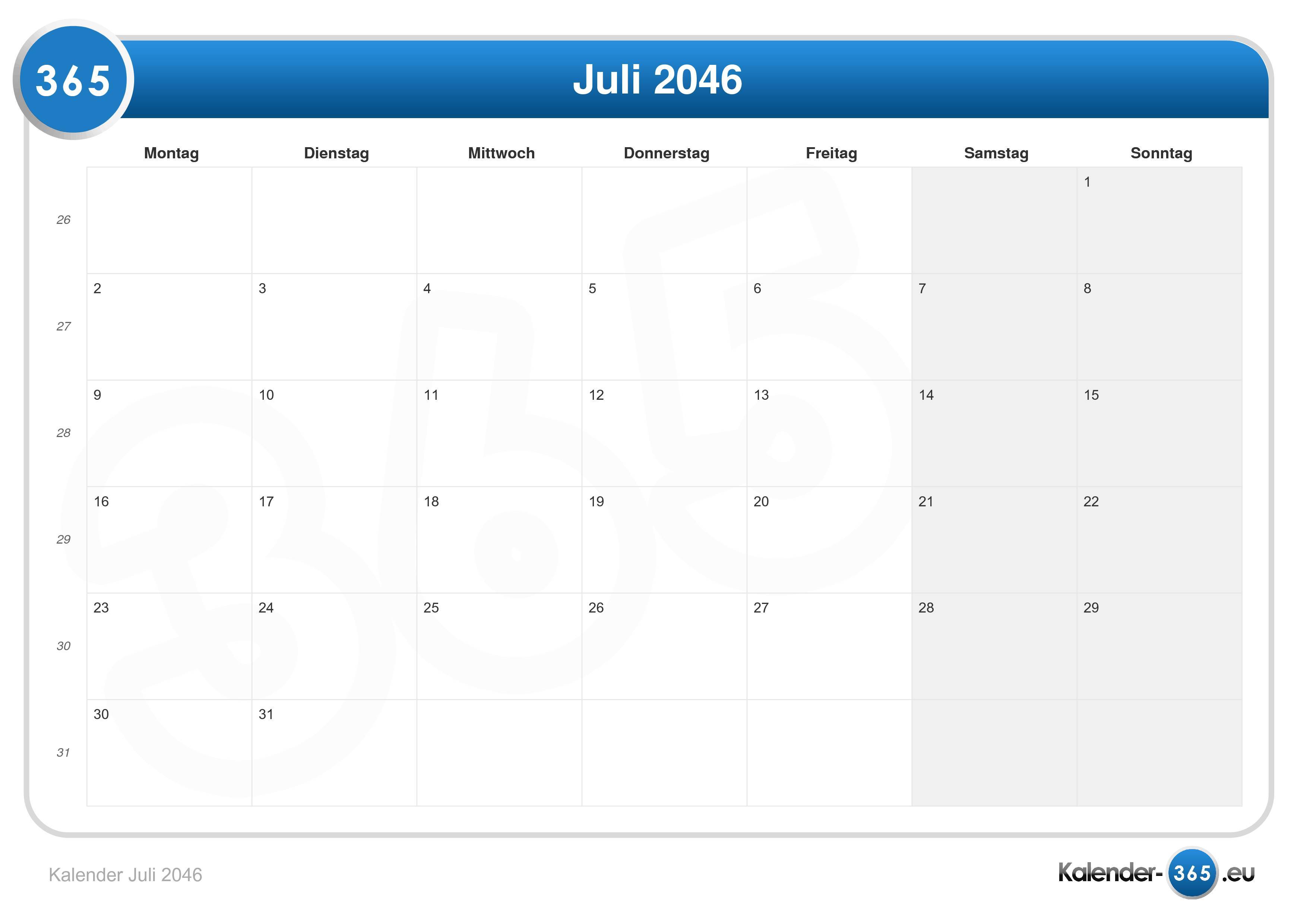 Dieser Juli 2046 Kalender ist hilfreich zum ersehen von z.B. Urlaubszeiten.
