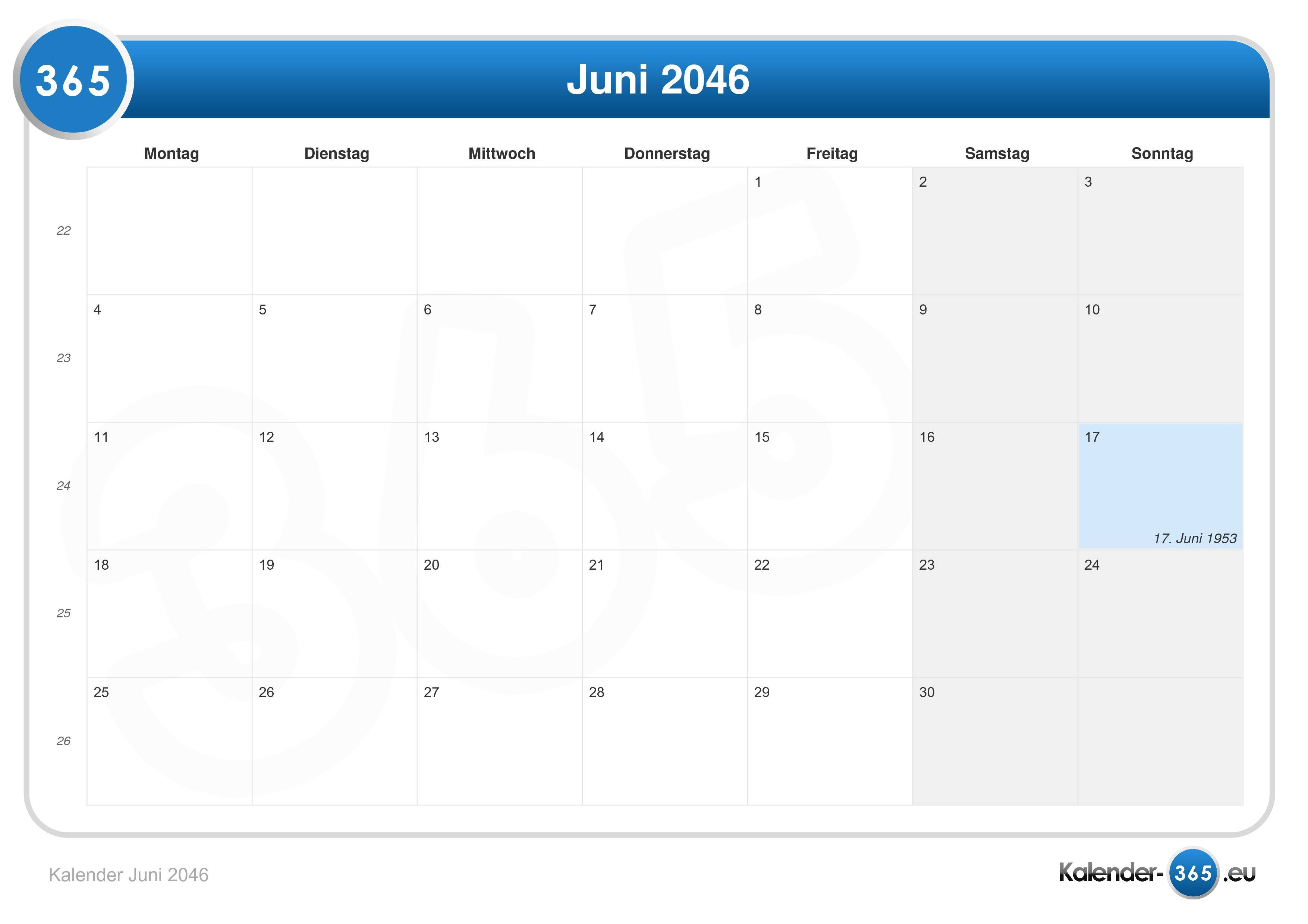 Dieser Juni 2046 Kalender ist hilfreich zum ersehen von z.B. Urlaubszeiten.